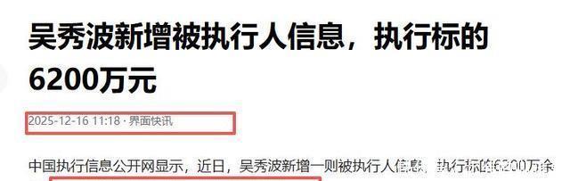 前言 12月16日,法院的强制执行通知书又砸到吴秀波头上,新增6200万元。 算上这次,他背的强制执行总金额已高达7.8亿,这个数字普通人从猴干起都整不到。 七年前还是叔圈顶流、人生赢家,如今却被钉死在“娱乐圈头号老赖”的耻辱柱上,一手好牌为何会打得稀烂?